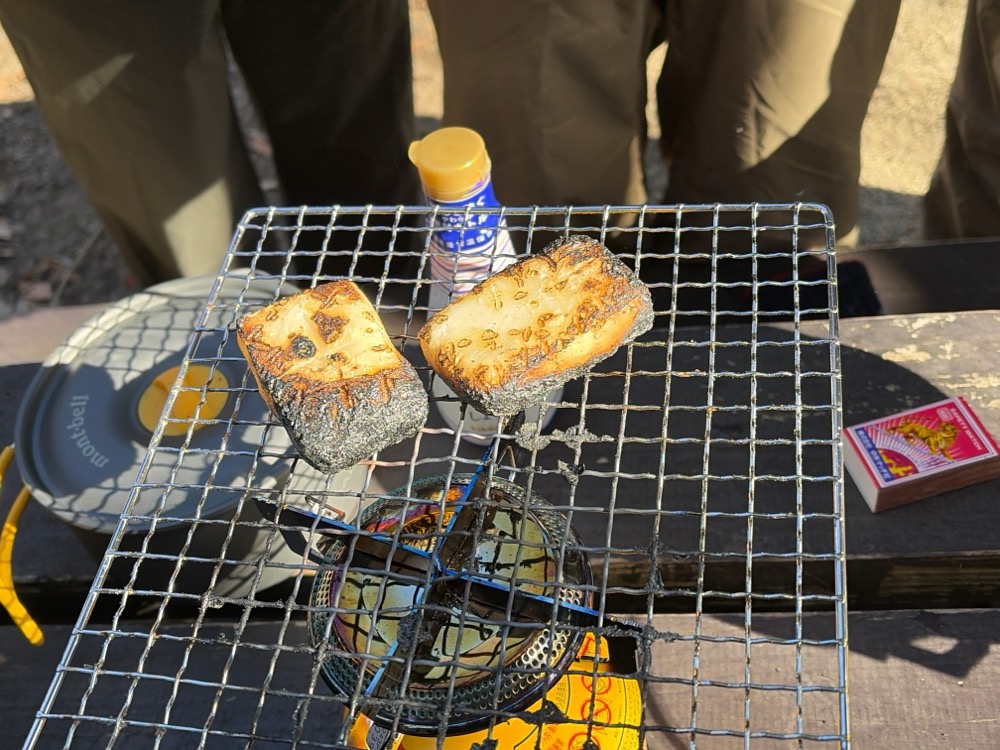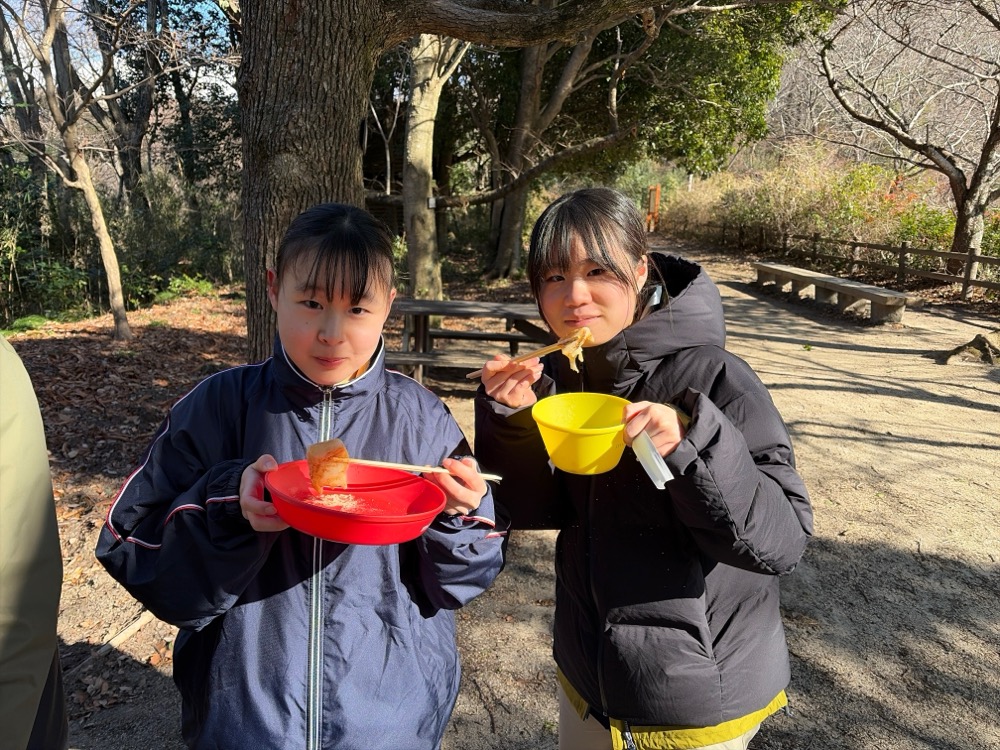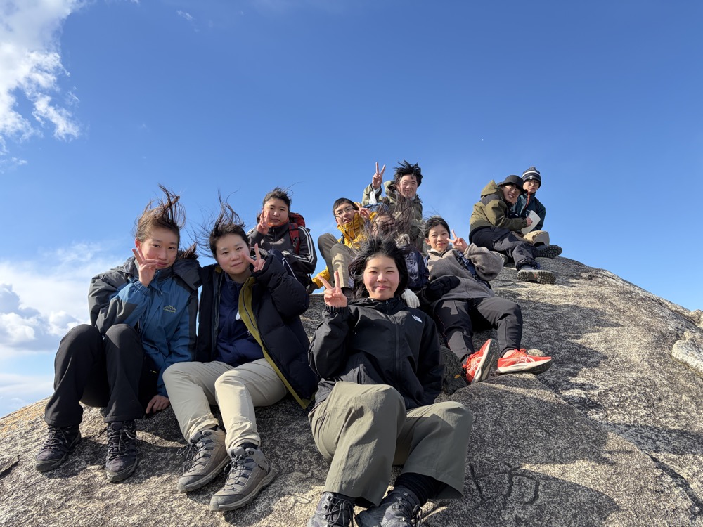 当日は風が非常に強く、標高が上がるにつれて冷たい風が吹きつけ、体が冷える場面もありましたが、部員同士で声を掛け合い支え合いながら登山を続けました。山頂付近では恒例の餅焼きを行い、寒さの中で食べる餅の美味しさに、生徒たちは終始笑顔を見せていました。