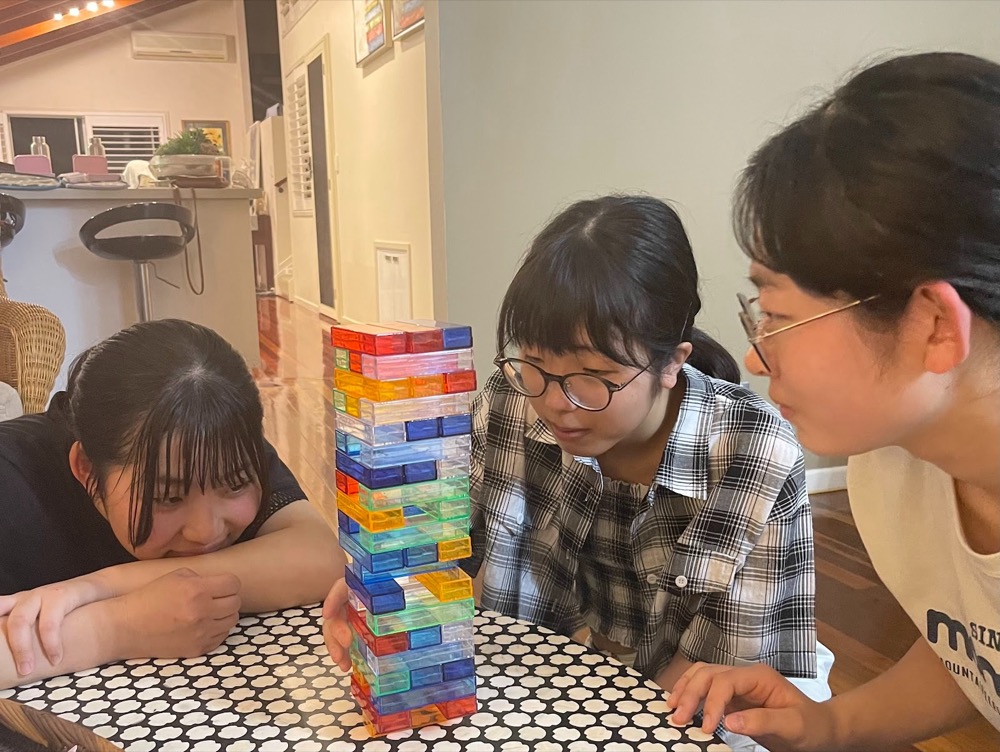 Our host mother and Rina and Minori’s host mother are friends and we often go to each other’s house. Today, they came to our house, ate dinner and played jenga, soccer game together. We ate pasta and apple strudel for dinner. It was very delicious. We played many times, so we became strong. We enjoyed playing it.
