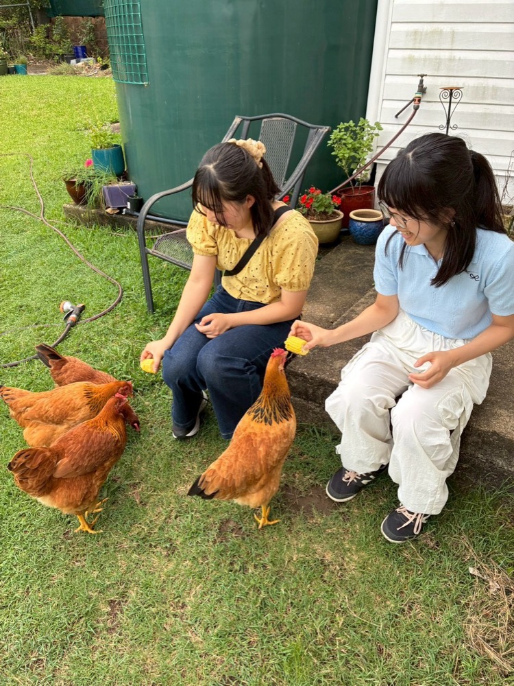 Before lunch, we saw the chickens that our host mother’s daughter has. We tried to feed them. I had never imagined that I could feed chickens before coming here!