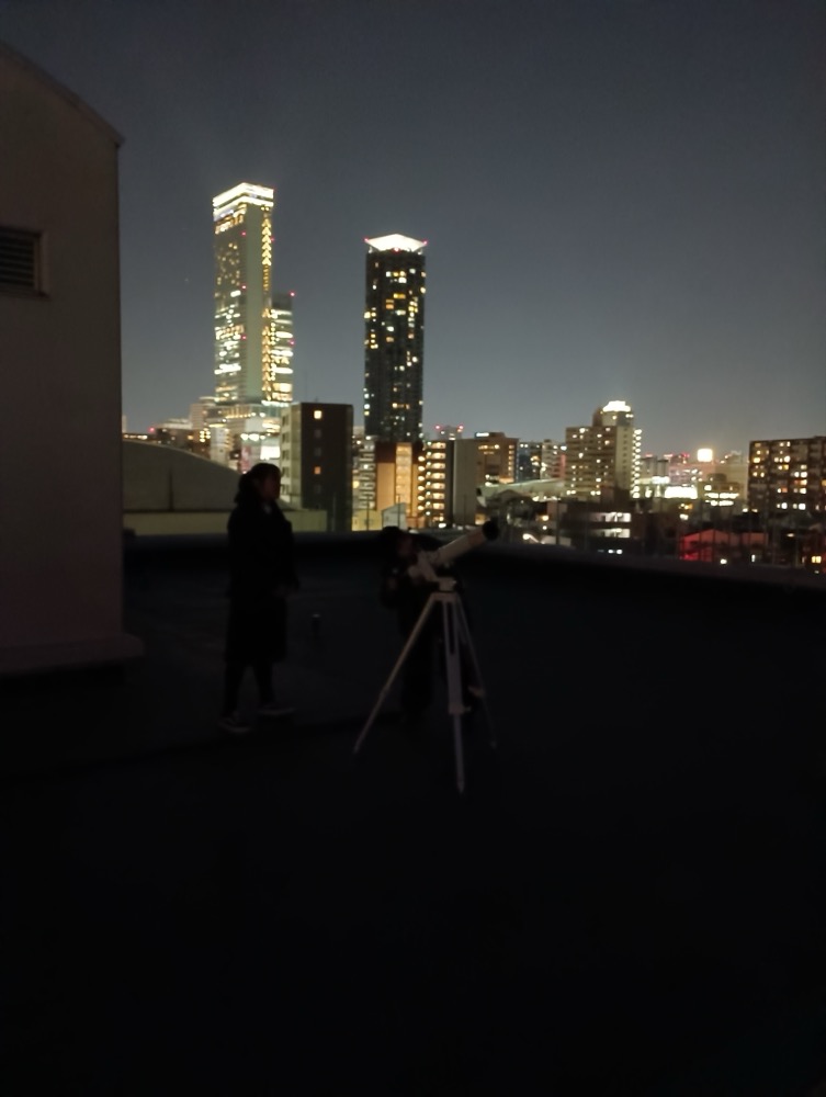 本校卒業生で現在大学で天文学を専攻している大学生にお越しいただき、大学での研究の内容や天文サークルの普及の取り組みなどをお話いただき、後輩たちは熱心にメモを取りながら聞き入っていました。その後は、望遠鏡の組み立てを行い、実際に観察を行いました。