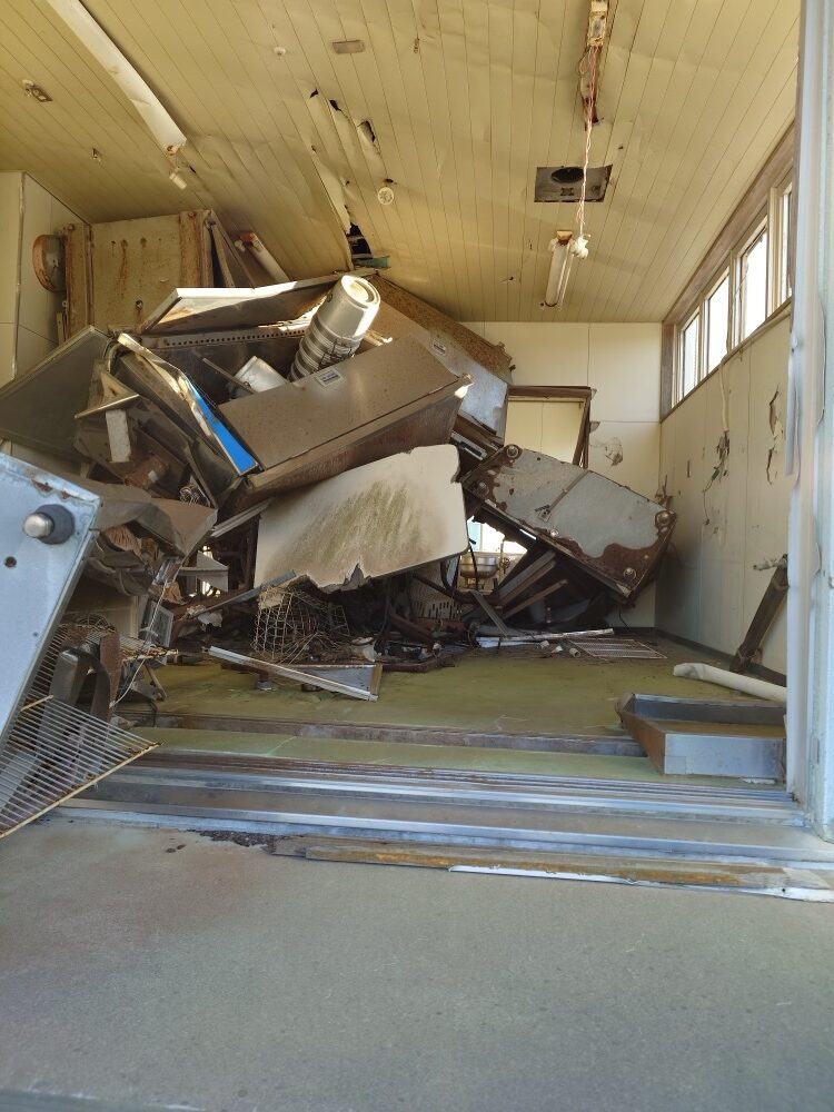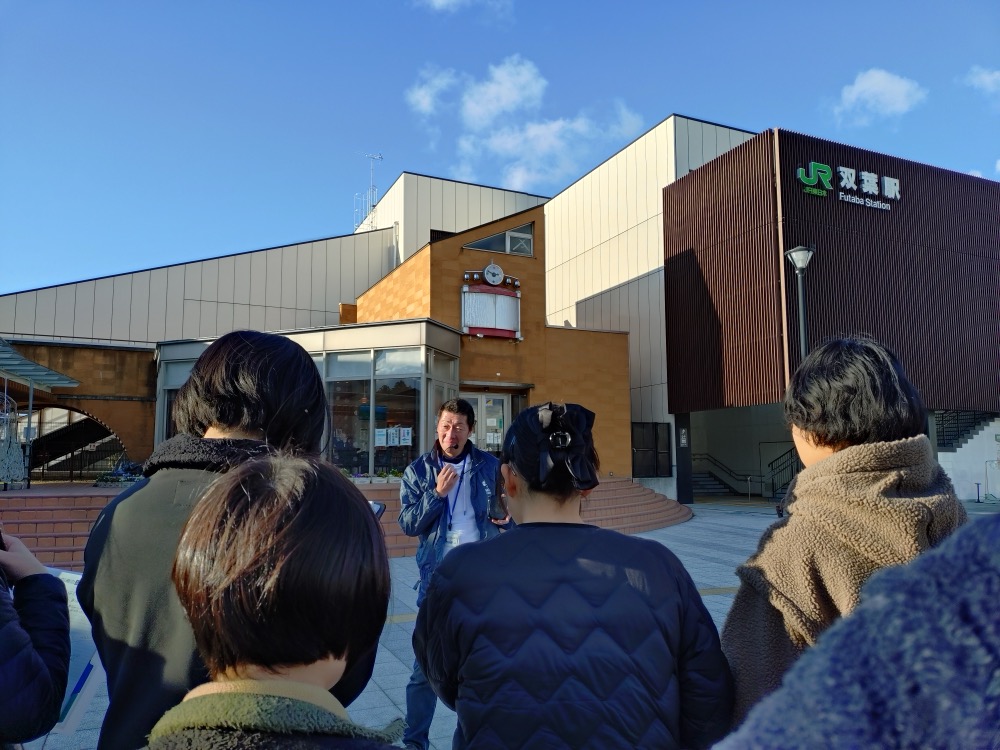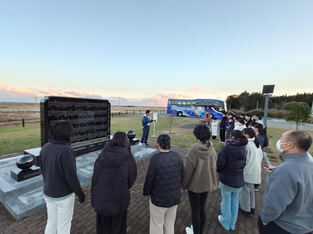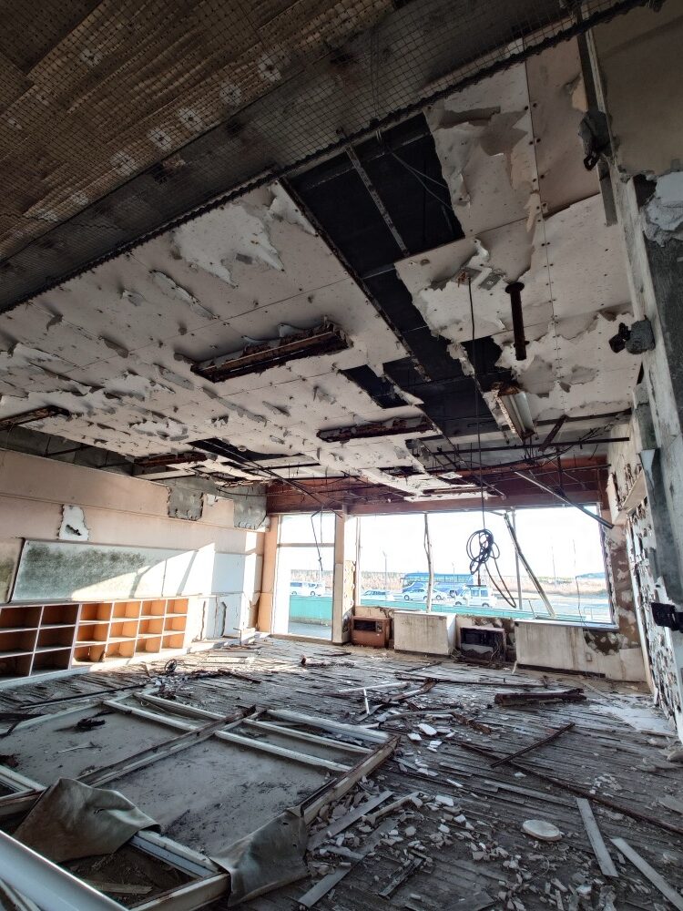 午後からは浪江町・双葉町フィールドワークとして、実際に震災当時に被災されたガイドの方より震災と事故の話を聞き、また津波の被害を受けながらも、すべての児童が近くの山に避難し助かった請戸小学校を見学。