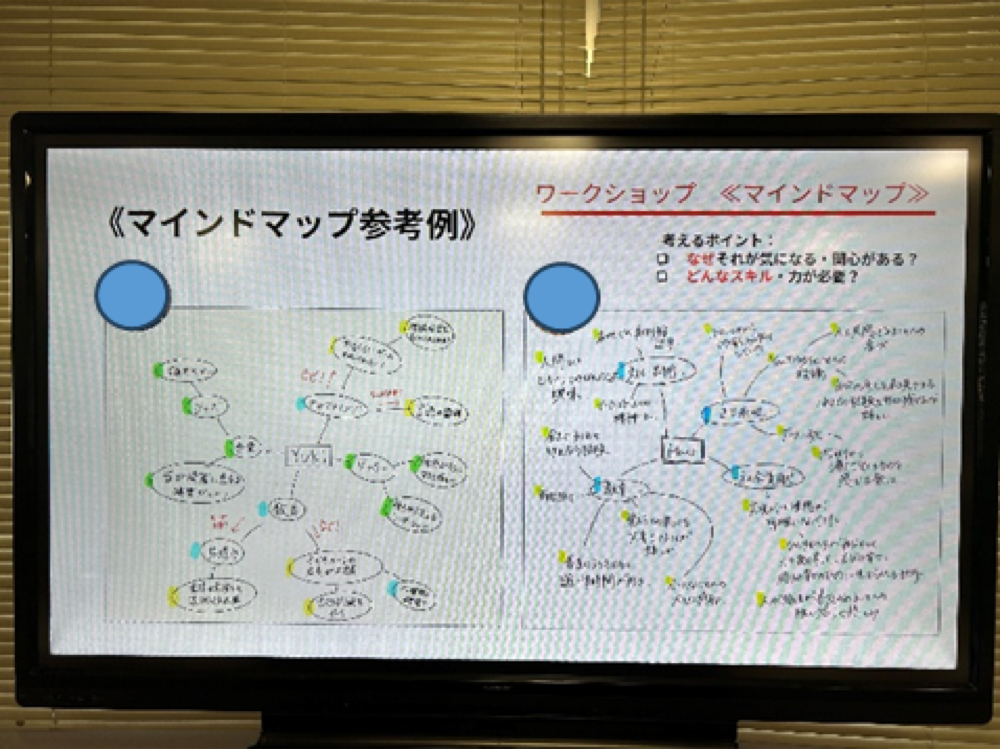 ・次に、高校生対象に「自分のやりたいこと」を見つけるワークショップを実施し、奨学生の方々のマインドマップを参考に各自のマインドマップを作成しました。