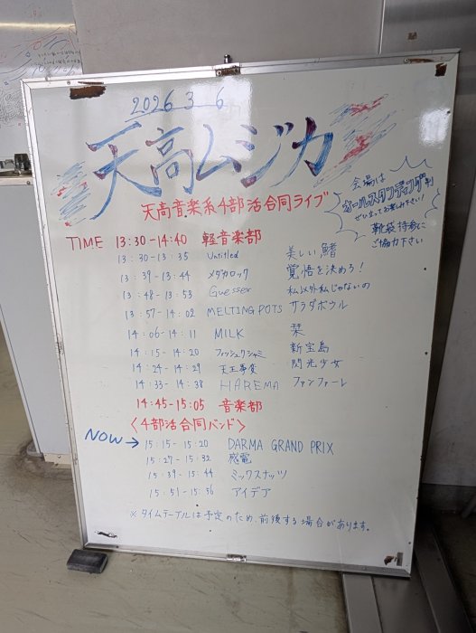 音楽系部活による合同ライブ「天高ムジカ」が開催されました。天王寺高校には、軽音学部・吹奏楽部・音楽部・フォークソング部という4つの音楽系部活があります。そんな日々切磋琢磨する4つの部活が一堂に会し、音楽系部活、ひいては文化部全体の活動を一層盛り上げるべく開催されたのが「天高ムジカ」です。各部活の演奏の後、ラストを飾るのが4部活の有志による合同バンドの演奏です。迫力ある演奏に、その日一番の盛り上がりを見せました。